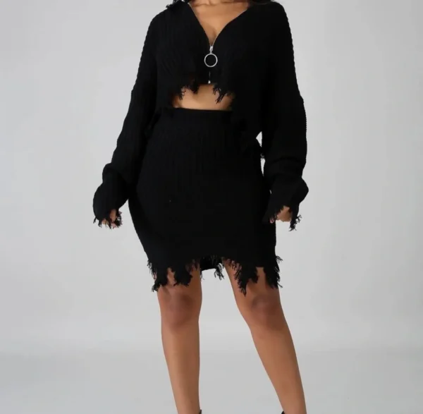 This knitted shreds skirt set features, a stretchy fabric, mock neckline long sleeves, front zipper Closure hoodie back, high waist skit, stretchy fabric, no closures. Model is wearing a small 100% Acrylic, Hand wash cold water do not bleach